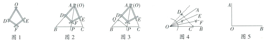【拓展迁移】小明探究完角平分仪后将工具的原理迁移到尺规作图的原理,并思考利用尺规“三等分特殊角”的方法.在“三等分角”的探索过程中,小明发现了许多利用尺规三等分特殊角的方法,利用尺规三等分$45°$角的方法就是其中的一种,方法如下:①如图4,在$\angle AOB$的边$OB$上取一点$C$;②以$OC$为边在$OB$上方作等边$\triangle OCD$,作射线$OD$;③作$\angle BOD$的平分线$OE$,作$\angle EOB$的平分线$OF$,则射线$OE,OF$将$\angle AOB$三等分.
