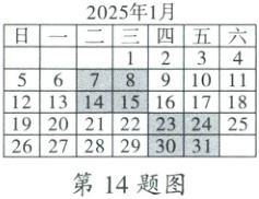 14. 在日历上,我们可以发现其中某些数满足一定的规律.如图是2025年1月份的日历.任意选择其中所示的方框部分,将每个方框部分中4个位置上的数交叉相乘,再相减,例如:$8×14-7×15=7$,$24×30-23×31=7$,发现结果都是7.若将方框部分的左上角数字设为$n$,用等式表示这一规律为