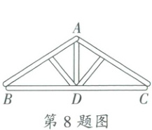 8.如图,屋顶钢架外框是等腰三角形,其中$AB=AC$,工人师傅在焊接立柱时,只用找到$BC$的中点$D$,
