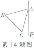 14.30 【解析】点 C 关于直线 AP 的对称点为点 D,连接 CD,BD,AD. 依题意得$AC = AD$,AP 垂直平分 CD,$\because\angle PAC = 15^{\circ}$,$\therefore\angle CAD = 30^{\circ}$.$\therefore\angle ACD=\angle ADC = 75^{\circ}$.$\because\triangle ABC$为等边三角形,$\therefore\angle BAC = 60^{\circ}$,$AB = AC$.$\therefore\angle BAD = 90^{\circ}$,$AB = AD$.$\therefore\angle ADB = 45^{\circ}$.$\therefore\angle BDC=\angle ADC-\angle ADB = 30^{\circ}$.