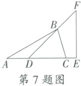 7. 如图,在$\bigtriangleup ABC$ 与$\bigtriangleup DEF$ 中,点$B$ 在$DF$ 上,点$D$ 在$AC$ 上,且$AB = AC$,若$\angle EDF = 4 5 ^ { \circ }$,$\angle ABD = 1 5 ^ { \circ }$,则$\angle BCE$ 的度数为(
