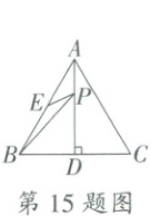 15. 如图,在等边$\bigtriangleup ABC$ 中,$AD$ 是$BC$ 边上的高线,且$AD = 6$,$E$ 是$AB$ 的中点,如果点$P$ 在$AD$ 上运动,那么$BP + EP$ 的最小值是