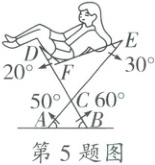 5.「生活情境·躺椅」(3分)如图是可调躺椅示意图(数据如图),$AE$与$BD$的交点为$C$,且$\angle A$、$\angle B$、$\angle E$保持不变,为了舒适,需调整$\angle D$的大小,使$\angle EFD = 110°$,则图中$\angle D$应(