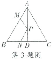 3.(3分)如图,在等边三角形$ABC$中,$AD$为$\angle BAC$的平分线,在$AB$,$CB$上分别取点$M$,$N$。且$AM = BN = 4$,$DN = 2$,在$AD$上有一动点$P$,则$PM + PN$的最小值为(