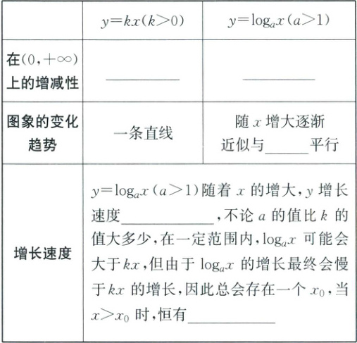 增长速度:$y=\log_{a}x(a\gt1)$随着$x$的增大,$y$增长速度逐渐变慢,不论$a$的值比$k$的值大多少,在一定范围内,$\log_{a}x$可能会大于$kx$,但由于$\log_{a}x$的增长最终会慢于$kx$的增长,因此总会存在一个$x_{0}$,当$x\gt x_{0}$时,恒有$\log_{a}x\lt kx$