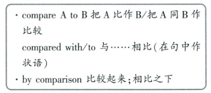 6. compare... with/to... 与……比较 (compare vt. 对比;比较;比喻;比拟 vi. 比得上;相比 comparison n. 比较;比拟)