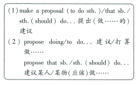 5. proposal *n*. 提议;建议[propose *vt*. 提名;建议;提供(解释);计划]