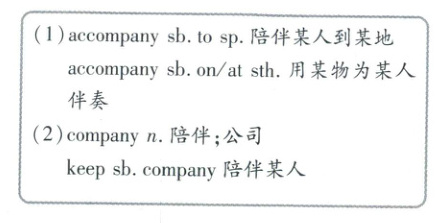 2. accompany *vt*. 陪同;陪伴;伴随;(尤指用钢琴)为……伴奏
