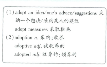 3. adopt *vt*. 采用;采取;采纳 *vt*. & *vi*. 领养