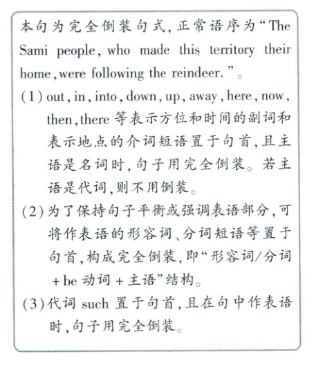 [教材原文] Following the reindeer were the Sami people, who made this territory their home. 在驯鹿之后来的是萨米人,他们在这片土地上安家落户。