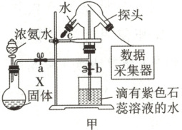 10.C 解析:左侧烧瓶中生成氨,氨极易溶于水,使三颈烧瓶内压强迅速减小,且氨水呈碱性,紫色石蕊溶液遇碱变为蓝色,故三颈烧瓶中会产生蓝色喷泉,A错误;C点时三颈烧瓶内气体压强最小,所以大气压和C点压强差最大,喷泉最剧烈,B错误;稀硫酸可以与氨反应生成硫酸铵,C正确;若X固体为 $ MnO_2$,用 $ H_2 O_2$ 溶液替代浓氨水,则左侧烧瓶中生成氧气,氧气不易溶于水,也不与水反应,三颈烧瓶中难以形成压强差,不会产生喷泉现象,D错误。