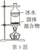 9.C 解析:$ KMnO_4$ 受热分解生成二氧化锰、锰酸钾、氧气,利用该装置无法实现 $ KMnO_4$ 和 $ MnO_2$ 的分离,A错误;$ NH_4 Cl$ 和 $ NaOH$ 加热反应生成氯化钠、氨、水,无法实现 $ NH_4 Cl$ 和 $ NaOH$ 的分离,B错误;$ NH_4 Cl$ 加热分解为氨、氯化氢,遇到装有冰水的烧瓶,两者反应生成氯化铵固体附在烧瓶底部,$ NaCl$ 在烧杯中,达到了分离两者且成分不变的目的,C正确;$ NH_4 Cl$ 加热分解为氨、氯化氢,遇到装有冰水的烧瓶,两者反应生成氯化铵固体附在烧瓶底部,但 $ I_2$ 易升华,加热升华的碘蒸气遇到装有冰水的烧瓶,也附在烧瓶的底部,无法实现两者的分离,D错误。