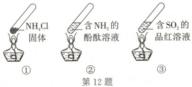 12.C 解析:对于①来说,$ NH_4 Cl$ 受热分解生成的氨和氯化氢遇冷重新反应生成氯化铵,所以封管上部汇集了固体 $ NH_4 Cl$,发生了化学变化,与碘升华实验原理不同,A错误;对于②来说,加热时,氨逸出,溶液由红色变为无色,冷却后氨又溶解在酚酞溶液中使溶液变为红色,B错误;对于③来说,$ SO_2$ 与品红溶液反应生成无色物质而使品红溶液褪色,无色物质受热易分解,所以加热时③中溶液变红,冷却后又变为无色,体现了 $ SO_2$ 的漂白性,C正确;②中溶液褪色是因为氨逸出,溶液的碱性减弱,③中溶液褪色是因为 $ SO_2$ 具有漂白性,其褪色原理不相同,D错误。