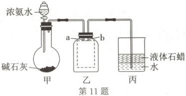 11.C 解析:碱石灰溶于水放热可使氨水中的氨逸出,则甲中制备 $ NH_3$ 利用了 $ NH_3 · H_2 O$ 的分解反应,A正确;用向下排空气法收集氨,乙中的集气瓶内a导管短、b导管长,B正确;氨极易溶于水,丙装置中导管直接伸入水中,不能防止倒吸,C错误;向收集好的 $ NH_3$ 中通入少量 $ Cl_2$,发生反应:$8 NH_3+3 Cl_2 \longrightarrow 6 NH_4 Cl+ N_2$,能观察到白烟,D正确。