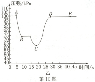 10. 科学探究 现用传感技术测定喷泉实验中的压强变化来认识喷泉实验的原理(如图甲、乙)。下列说法正确的是(