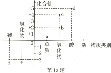 13.C 解析:结合“价类二维图”可知,a为 $ N_2$,b为 $ NO$,c为 $ NO_2$,d为 $ HNO_3$,e为 $ NH_3$,f为 $ NH_3 · H_2 O$。$ N_2$ 性质稳定,可作保护气,但在一定条件下也能与氧气、氢气等发生反应,A错误;c是 $ NO_2$,与水反应生成 $ HNO_3$ 和 $ NO$:$3 NO_2+ H_2 O \longrightarrow 2 HNO_3+ NO$,根据化合价的变化情况分析,$ NO_2$ 既作氧化剂,又作还原剂,B错误;氮的化合物中,可实现 $ NH_3 \overset{ O_2}{\longrightarrow} NO \overset{ O_2}{\longrightarrow} NO_2 \overset{ H_2 O}{\longrightarrow} HNO_3$ 的转化,C正确;f是 $ NH_3 · H_2 O$,在水溶液中发生部分电离,是弱碱,D错误。