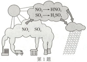 1.C 解析:pH小于5.6的雨水为酸雨,A错误;汽车排气口处主要发生的反应为N₂+O₂$\xlongequal{高温}$2NO,B错误;可以通过“汽车尾气催化净化”“燃煤脱硫”等措施减少氮氧化物和二氧化硫的排放,遏制酸雨形成,C正确;二氧化氮不属于酸性氧化物,D错误。