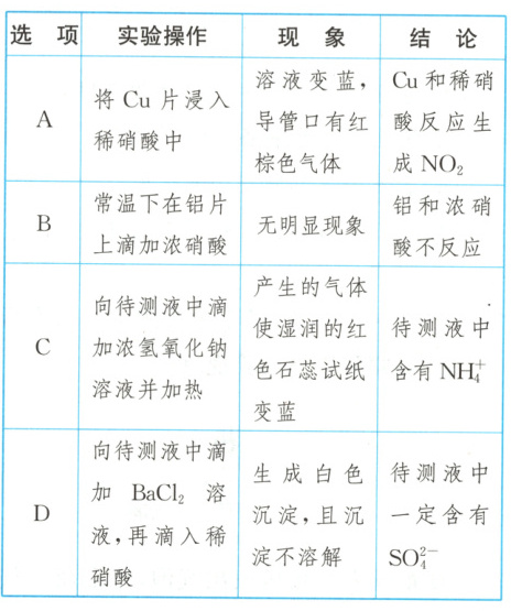 9.C 解析:铜与稀硝酸反应生成NO,NO在导管口遇空气变为NO₂,有红棕色气体出现,A错误;浓硝酸为强氧化剂,能氧化大多数物质,常温下铁、铝能被浓硝酸氧化形成致密的氧化膜从而阻止进一步反应,所以看不到现象,B错误;能使湿润的红色石蕊试纸变蓝的气体为氨,则向待测液中滴加浓氢氧化钠溶液并加热,产生使湿润的红色石蕊试纸变蓝的气体,可说明待测液中含有NH₄⁺,C正确;白色沉淀可能为AgCl,由操作和现象可知,待测液中不一定含有SO₄²⁻,D错误。