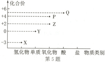 5.C 解析:X是N的-3价氢化物,X是NH₃;Y是N的单质,Y是N₂;Z是N的+2价氧化物,Z是NO;P是N的+4价氧化物,P是NO₂;Q是N的+5价酸,Q是HNO₃。常温下,铝的表面被浓硝酸氧化生成一层致密的氧化膜,阻止酸与内层金属进一步反应,故可以用铝制容器盛装浓硝酸,A正确;NH₃、N₂、NO₂均不属于电解质,B正确;浓硝酸见光或者受热会分解生成NO₂,C错误;NO与CO在汽车催化转化器中会转化成N₂和CO₂,D正确。