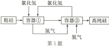 5.C 解析:高纯硅可以用于制作芯片、太阳能电池等,是 一种重要的无机非金属材料,A正确;硅、三氯硅烷和氢气 在高温条件下都能与氧气反应,所以制备过程中需要隔绝 空气,B正确;容器①中发生的反应为粗硅在高温条件下与 氯化氢反应生成三氯硅烷和氢气,属于置换反应,C错误; 该工艺流程的优点是氢气和氯化氢可以循环使用,有利于 提高原料的利用率,D正确。