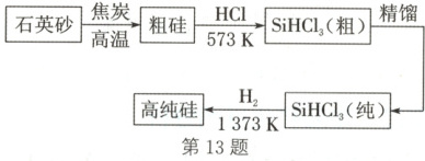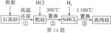 14.C 解析:制备粗硅的反应为$SiO2+2C\xlongequal{高温}Si+2CO↑, A$错误;光导纤维的主要成分为二氧化硅,B错误;流程② 生成的氢气和流程③消耗的氢气,以及硅和三氯硅烷都能 与氧气反应,所以流程②③需在无氧条件下进行,C正确; 粗硅与氯化氢在300℃条件下发生反应②生成三氯硅烷和 氢气,三氯硅烷与氢气在1100℃条件下发生反应③得到 高纯硅和氯化氢,氢气和氯化氢可以循环利用,D错误。