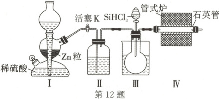 12.D 解析:装置Ⅰ是启普发生器,目的是制备氢气,除了 可以制备氢气,还可以使用碳酸钙块状固体和盐酸在启普 发生器中制备二氧化碳,A正确;为确保反应顺利进行,装 置Ⅱ为干燥装置,浓硫酸是常用的干燥剂,除去水蒸气,装 置Ⅲ需水浴加热,目的是使SiHCl3汽化,与氢气充分混合, B正确;高纯硅是良好的半导体材料,可用于制芯片及太阳 能电池,C正确;铁与盐酸反应生成$Fe^{2+},$加入KSCN溶液 不反应,应该加入氧化剂把$Fe^{2+}$氧化为$Fe^{3+},$溶液变红,才 能检验,D错误。