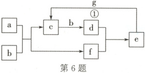 6.D 解析:b是能使带火星的木条复燃的无色、无味气体,则b是$O_{2}$,g是一种红色金属单质,则g是$Cu$,a能与氧气反应生成c与f,c能与氧气反应生成d,则c为氧化物,e的相对分子质量比d的大18,则f是水,d与水反应得到e,e能与$Cu$反应得到c,则e是硫酸、d是三氧化硫,则a是硫化氢、c是二氧化硫。a是硫化氢,属于化合物,A正确;二氧化硫和氧气反应生成三氧化硫,该反应是化合反应,原子利用率为$100\%$,B正确;常温下铝在浓硫酸中钝化,可使用铝制容器进行储存和运输浓硫酸,C正确;铜和浓硫酸反应需要加热,常温下不反应,D错误。
