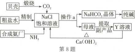 8.A 解析:粗盐提纯时,由于$Na_{2}CO_{3}$溶液的作用是除去$Ca^{2+}$和过量氯化钡溶液中的$Ba^{2+}$,所以$BaCl_{2}$溶液需在$Na_{2}CO_{3}$溶液之前加入,且盐酸需在过滤后加入,A错误;饱和食盐水中应该先通入氨,再通入二氧化碳,这样有利于生成更多的$NaHCO_{3}$,从而有较多的$NaHCO_{3}$晶体析出,通过过滤(操作a)可将$NaHCO_{3}$晶体从母液中分离出来,B正确;由图示可知,可循环使用的物质有$CO_{2}$和$NH_{3}$,C正确;母液中的溶质有$NH_{4}Cl$和没有析出的碳酸氢钠,$NH_{4}Cl$可用作氮肥,D正确。