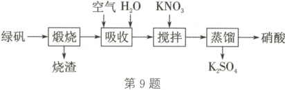 9.B 解析:由于绿矾“煅烧”后产生$SO_{2}$,硫的化合价降低,则$SO_{2}$为还原产物,根据氧化还原反应规律可知必有氧化产物$Fe_{2}O_{3}$同时生成,A正确;“煅烧”后产生$SO_{2}$、$SO_{3}$和$H_{2}O$三种气体,三氧化硫和氯化钡溶液反应生成硫酸钡沉淀,二氧化硫与氯化钡溶液不反应,B错误;“吸收”过程中发生的氧化还原反应为$2SO_{2}+2H_{2}O+O_{2}\xlongequal{}2H_{2}SO_{4}$,C正确;加入硝酸钾制得硝酸是因为硫酸的沸点高于硝酸,经过蒸馏即可得硝酸,D正确。