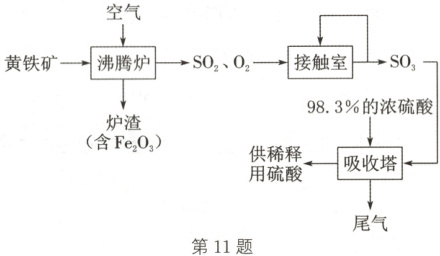11.B 解析:$Fe_{2}O_{3}$不具有磁性,不是磁性氧化物,A错误;$SO_{2}$与$O_{2}$在催化剂$V_{2}O_{5}$的作用下生成$SO_{3}$,因此接触室中需加入$V_{2}O_{5}$作催化剂加快反应,B正确;沸腾炉中发生反应:$4FeS_{2}+11O_{2}\xlongequal{点燃}2Fe_{2}O_{3}+8SO_{2}$,根据氧元素的化合价变化可知,每$4molFeS_{2}$参加反应,转移$44mol$电子,则$1molFeS_{2}$反应,转移$11mol$电子,C错误;吸收塔中$98.3\%$的浓硫酸不可以换为$H_{2}O$,用$H_{2}O$吸收$SO_{3}$会产生酸雾,不利于$SO_{3}$的吸收,D错误。