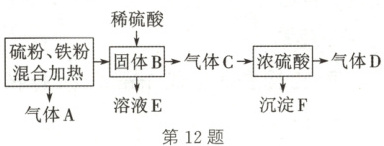 12.C 解析:首先铁粉和硫粉反应生成$FeS$,则固体B是$FeS$,S和$O_{2}$反应生成$SO_{2}$,则气体A中含二氧化硫,$FeS$与稀硫酸反应生成$FeSO_{4}$和$H_{2}S$,$H_{2}S$和$H_{2}SO_{4}$(浓)反应生成S、$SO_{2}$和$H_{2}O$,则沉淀F是S。由以上分析可知,气体A中$SO_{2}$是氧化产物,气体D中$SO_{2}$是硫酸中硫被还原生成的还原产物,A错误;铁粉和硫粉反应生成$FeS$,S和$O_{2}$反应生成$SO_{2}$,$H_{2}S$和$H_{2}SO_{4}$(浓)反应生成S、$SO_{2}$和$H_{2}O$,反应中S元素化合价都发生改变,故硫元素至少参加了3个氧化还原反应,B错误;沉淀F是S,S与$NaOH$溶液在加热的条件下反应生成$Na_{2}S$、$Na_{2}SO_{3}$和$H_{2}O$,C正确;固体B为$FeS$,$FeS$和浓硫酸反应生成$Fe_{2}(SO_{4})_{3}$、S、$SO_{2}$和$H_{2}O$,其中被氧化的元素为$Fe$和S,被还原的元素为S,故发生反应时被氧化的和被还原的不均为同一种元素,D错误。