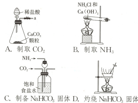 3.D 解析:实验室可以用CaCO₃和稀盐酸来制备CO₂,反应原理为CaCO₃+2HCl══CaCl₂+H₂O+CO₂↑,A正确;实验室可以加热Ca(OH)₂和NH₄Cl固体混合物来制备NH₃,反应原理为$Ca(OH)₂+2NH₄Cl\triangle══CaCl₂+2H₂O+2NH₃↑,$B正确;根据侯氏制碱法可知,向饱和食盐水中通入NH₃和CO₂可制得NaHCO₃,NH₃极易溶于水,需用防倒吸装置,CO₂能溶于水,不需要防倒吸,C正确;对固体进行灼烧需在坩埚或硬质玻璃管中进行,不能在蒸发皿中完成,D错误。