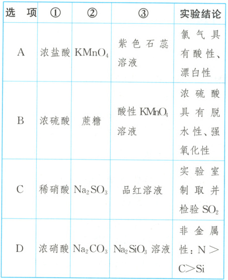 12.B 解析:氯气没有漂白性、酸性,氯气与水反应产生了盐酸和次氯酸,次氯酸具有漂白性,A错误;浓硫酸具有脱水性,使蔗糖脱水变为C,又因浓硫酸具有强氧化性,与C发生氧化还原反应生成的二氧化硫能使酸性KMnO₄溶液褪色,利用图示装置进行实验,实验现象能说明浓硫酸具有脱水性、强氧化性,B正确;稀硝酸把Na₂SO₃氧化为Na₂SO₄,不能用稀硝酸和Na₂SO₃反应制取SO₂,C错误;浓硝酸与碳酸钠反应生成二氧化碳,但浓硝酸易挥发,硝酸、碳酸均可与硅酸钠溶液反应生成硅酸沉淀,则不能比较碳酸与硅酸的酸性强弱,也就不能比较C、Si非金属性的强弱,应排除硝酸的干扰,D错误。