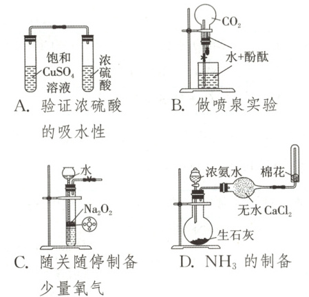8.A 解析:可根据左侧试管中饱和CuSO₄溶液析出蓝色晶体说明水减少,判断浓硫酸有吸水性,A正确;CO₂在水中溶解度比较小,不能用CO₂、H₂O做喷泉实验,B错误;由于Na₂O₂为粉末,此装置无法实现随关随停的目的,C错误;氨会和无水氯化钙反应,不能使用无水氯化钙干燥氨,D错误。