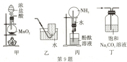 9.D 解析:本题借助气体的制备、净化及喷泉实验装置考查了化学实验基本操作。MnO₂固体在加热条件下将浓盐酸氧化为Cl₂,属于固液加热反应,甲装置可用于制备Cl₂,A项正确;C₂H₄不溶于水,可用排水法收集,B项正确;挤压胶头滴管,水进入烧瓶将NH₃溶解,烧瓶中气体大量减少,压强迅速减小,打开弹簧夹,酚酞溶液迅速被压入烧瓶中形成红色喷泉,证明NH₃极易溶于水且溶液呈碱性,C项正确;Na₂CO₃既可与HCl反应,又会吸收CO₂,不能达到实验目的,应该选用饱和NaHCO₃溶液,D项错误。