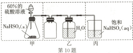 10.C 解析:A项,亚硫酸氢钠和较浓的硫酸不需加热即可反应生成二氧化硫气体;B项,二氧化硫溶于水得到SO₂水溶液;C项,二氧化硫不和亚硫酸氢钠溶液反应,不能用饱和NaHSO₃溶液吸收尾气中的二氧化硫;D项,装置乙中二氧化硫和水反应生成亚硫酸,具有酸性,滴入紫色石蕊溶液后变红。