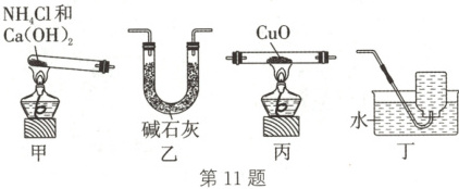 11.D 解析:实验室采用氯化铵与熟石灰混合加热制取氨,采用固体加热型发生装置,A正确;碱石灰不能与氨发生反应,能用来干燥氨,B正确;氨具有一定的还原性,能与氧化铜发生氧化还原反应,通过观察玻璃管中固体的颜色变化,可判断反应的发生,从而证明氨的还原性,C正确;NH₃极易溶于水,用装置丁收集尾气会倒吸,D错误。