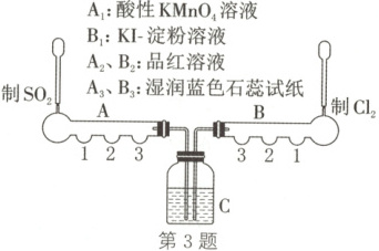 3.D 解析:采用Cu与浓硫酸反应制备SO₂时需要加热,该装置中无加热装置,A错误;A₁处的酸性KMnO₄溶液褪色体现了SO₂的还原性,原理为5SO₂+2KMnO₄+2H₂O$\longrightarrow$ 2MnSO₄+K₂SO₄+2H₂SO₄,A₂处的品红溶液遇SO₂会发生褪色,体现了SO₂的漂白性,B错误;A₃、B₃两处的实验现象不一样,A₃处的湿润蓝色石蕊试纸只变红不褪色,B₃处的湿润蓝色石蕊试纸先变红后褪色,褪色是因为生成了具有强氧化性的HClO,C错误;试剂瓶C中的溶液若是CaCl₂溶液,则可能会出现白色沉淀,发生反应的离子方程式为SO₂+Cl₂+2H₂O+Ca²⁺$\longrightarrow$ CaSO₄↓+2Cl⁻+4H⁺,D正确。
