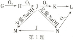 1.D 解析:根据转化关系:G$\overset{O_{2}}{ \rightarrow }$H$\overset{O_{2}}{ \rightarrow }$J$\overset{O_{2}}{ \rightarrow }$K$\overset{ }{ \rightarrow }$L,常温、常压下,G、J均为无色气体,J具有漂白性,可知J为SO₂,K为SO₃,G为H₂S,H为S,M为NaHSO₃,N为Na₂SO₃,L为Na₂SO₄。H₂S和SO₃均能与NaOH溶液反应,A正确;S和Na₂SO₃中S的化合价处于S的中间价态,既具有氧化性也具有还原性,B正确;M为NaHSO₃,N为Na₂SO₃,二者的溶液中所含元素都为Na、S、O、H,C正确;H₂S和足量的SO₂反应生成S单质和水,2H₂S+SO₂$\longrightarrow$ 3S+2H₂O,1mol H₂S参加反应,转移2mol电子,转移电子数为2Nₐ,D错误。