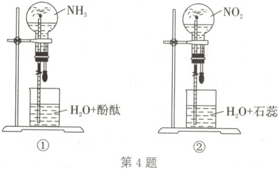 4.D 解析:氨是无色气体,溶于水所得氨水呈碱性,能使酚酞溶液变红,NO₂是红棕色气体,溶于水可生成硝酸,能使石蕊溶液变红,故气体颜色不同,“喷泉”颜色都呈红色,A正确;氨溶于水后溶液呈碱性,NO₂溶于水后溶液呈酸性,前者pH大,B正确;①中氨完全溶解,溶液的体积等于氨的体积,②中发生反应:3NO₂+H₂O$\longrightarrow$ 2HNO₃+NO,溶液的体积等于NO₂的体积的$\frac{2}{3}$,C正确;①中氨完全溶解,溶液的体积等于氨的体积,所得溶液浓度为$\frac{VL}{V_mL}$ =$\frac{1}{V_m}$mol/L,②中发生反应:3NO₂+H₂O$\longrightarrow$ 2HNO₃+NO,VL二氧化氮反应得到$\frac{1}{3}$VLNO,溶液的体积为$\frac{2}{3}$VL,而有$\frac{2}{3}$VL的NO₂转化为硝酸,溶液浓度为$\frac{\frac{2}{3}VL}{V_m\frac{2}{3}VL}$ =$\frac{1}{V_m}$mol/L,故溶液的物质的量浓度为①=②,D错误。