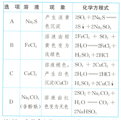 2.A 解析:过量SO₂与0.1mol·L⁻¹的Na₂S溶液反应,产生的淡黄色沉淀是S,还生成NaHSO₃,SO₂过量时不生成Na₂SO₃,因此,总反应的化学方程式为5SO₂+2Na₂S+2H₂O$\longrightarrow$ 3S↓+4NaHSO₃,A错误;过量SO₂与0.1mol·L⁻¹的FeCl₃溶液反应,生成FeCl₂、H₂SO₄、HCl,总反应的化学方程式为2FeCl₃+SO₂+2H₂O$\longrightarrow$2FeCl₂+H₂SO₄+2HCl,B正确;过量SO₂与0.1mol·L⁻¹的CuCl₂溶液反应,生成的白色沉淀是CuCl,总反应的化学方程式为SO₂+2CuCl₂+2H₂O$\longrightarrow$ 2HCl+H₂SO₄+2CuCl↓,C正确;Na₂CO₃溶液显碱性,能使酚酞溶液变红,过量SO₂与0.1mol·L⁻¹的Na₂CO₃溶液反应,生成CO₂、NaHSO₃,NaHSO₃溶液显酸性,因此,溶液由红色变为无色,总反应的化学方程式为2SO₂+Na₂CO₃+H₂O$\longrightarrow$ CO₂+2NaHSO₃,D正确。