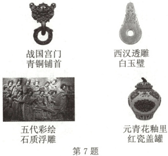 7.D 解析:青铜铺首是青铜器,青铜的主要成分是铜锡合金,A正确;透雕白玉璧是玉石,玉石的主要成分是硅酸盐,B正确;石质浮雕的主要成分是碳酸钙,C正确;青花釉里红瓷盖罐是陶瓷,陶瓷的主要成分是硅酸盐,D错误。