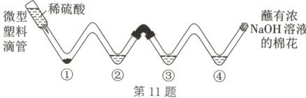 11.C 解析:①处稀硫酸与亚硫酸钠反应制取SO₂是复分解反应,体现硫酸的强酸性,A正确;②处SO₂使品红溶液褪色,体现SO₂的漂白性,但SO₂使品红溶液褪色为可逆过程,加热会恢复红色,B正确;酸性高锰酸钾溶液褪色体现SO₂的还原性,NaOH - 酚酞溶液褪色体现SO₂是酸性氧化物,褪色原理不同,C错误;稀硫酸与NaHSO₃溶液也可反应,生成硫酸钠、二氧化硫和水,D正确。