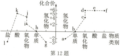 12.C 解析:S原子最外层有6个电子,可知S最低为−2价,最高为+6价,N原子最外层有5个电子,可知N最低为−3价,最高为+5价,结合“价类二维图”可知,右边是S元素的单质及部分化合物的“价类二维图”,左边是N元素的单质及部分化合物的“价类二维图”。故a是H₂S,b是S,c是SO₂,d是SO₃,e是H₂SO₄,f是硫酸盐,g是NH₃,h是N₂,i是NO,j是NO₂,k是HNO₃,l是铵盐。NH₃与H₂SO₄可发生反应生成(NH₄)₂SO₄,A错误;由于浓硫酸具有强氧化性和酸性,因此不能干燥具有还原性的H₂S,也不能干燥碱性气体NH₃,而浓硫酸与SO₂不能发生反应,因此可以干燥SO₂,B错误;汽车尾气系统中安装的催化转化器能够实现NO和CO转化为N₂和CO₂,C正确;HNO₃不稳定,见光或受热会发生分解反应产生NO₂,故不需要加入还原剂也可以实现由HNO₃向NO₂的转化,D错误。