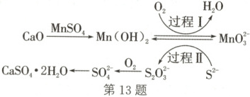 13.C 解析:过程Ⅰ中O₂将二价锰氧化为四价锰,根据转移电子守恒可知,离子方程式为2Mn(OH)₂+O₂+4OH⁻$\longrightarrow$ 2MnO₂+4H₂O,A正确;在过程Ⅰ中,Mn(OH)₂中Mn的化合价升高,作还原剂,生成MnO₂,在过程Ⅱ中,MnO₂中Mn的化合价降低,作氧化剂,又重新生成Mn(OH)₂,故除去S²⁻的过程中,Mn(OH)₂起催化作用,B正确;S₂O₃²⁻转化为SO₄²⁻的过程中,硫元素化合价共升高了8,共转移8个电子,由O₂~4e⁻可知,n(S₂O₃²⁻):n(O₂)=1:2,C错误;整个过程涉及的氧化还原反应有过程Ⅰ、过程Ⅱ、S₂O₃²⁻转化为SO₄²⁻,CaO转化为Mn(OH)₂可以通过CaO$\longrightarrow$ Ca(OH)₂$\longrightarrow$Mn(OH)₂实现,该过程涉及复分解反应,D正确。