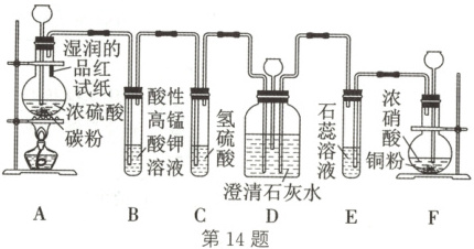(1)碳粉与浓硫酸发生反应生成二氧化碳、二氧化硫和水,化学方程式是C+2H₂SO₄(浓)$\overset{△}{ \longrightarrow }$CO₂↑+2SO₂↑+2H₂O;二氧化硫有漂白性,使A中湿润的品红试纸褪色。