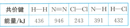 11. 在$25\ \mathrm{℃}$和$101\ \mathrm{kPa}$条件下,断开$\mathrm{H_2}$、$\mathrm{N_2}$、$\mathrm{Cl_2}$、$\mathrm{NH_3}$、$\mathrm{HCl}$中的$1\ \mathrm{mol}$化学键所需能量如表: