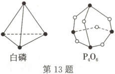 13. 已知白磷和$\mathrm{P_4O_6}$的分子结构如图所示,现提供如下化学键的键能[通常把断开(或形成)$1\ \mathrm{mol}$化学键吸收(或放出)的能量称为键能]:$\mathrm{P—P}$为$198\ \mathrm{kJ·mol^{-1}}$、$\mathrm{P—O}$为$360\ \mathrm{kJ·mol^{-1}}$、$\mathrm{O=O}$为$498\ \mathrm{kJ·mol^{-1}}$。