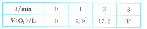 5. 变化观念 室温下,$10\ L\ 0.4\ mol·L^{-1}\ H_2O_2$ 溶液发生催化分解的反应为 $2H_2O_2 \stackrel{催化剂}{=} 2H_2O+O_2↑$,不同时刻测得生成 $O_2$ 的体积(已折算为标准状况)如表,已知反应至 $3\ min$ 时,$H_2O_2$ 分解了 $50\%$,溶液体积变化忽略不计。