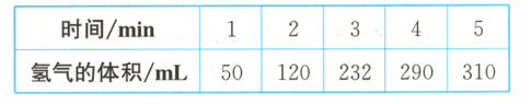 (1)根据题表中数据可知,在0~1min、1~2min、2~3min、3~4min、4~5min各时间段中生成氢气的体积分别是50mL、70mL、112mL、58mL、20mL,所以反应速率最大的时间段是2~3min,这是由于该反应是放热反应,此时温度高,反应速率大;反应速率最小的时间段是4~5min,这是由于此时H⁺的浓度小,反应速率小。